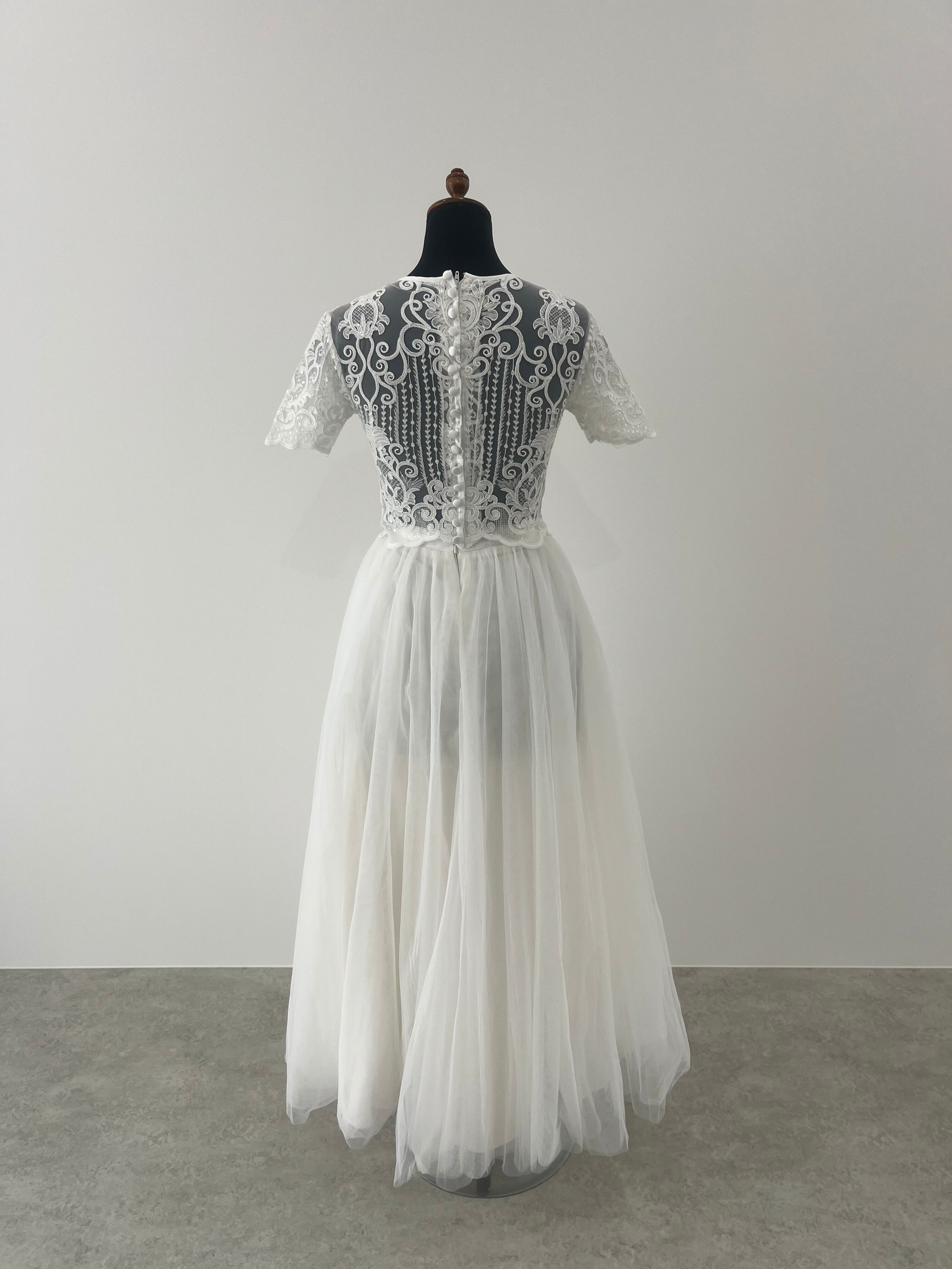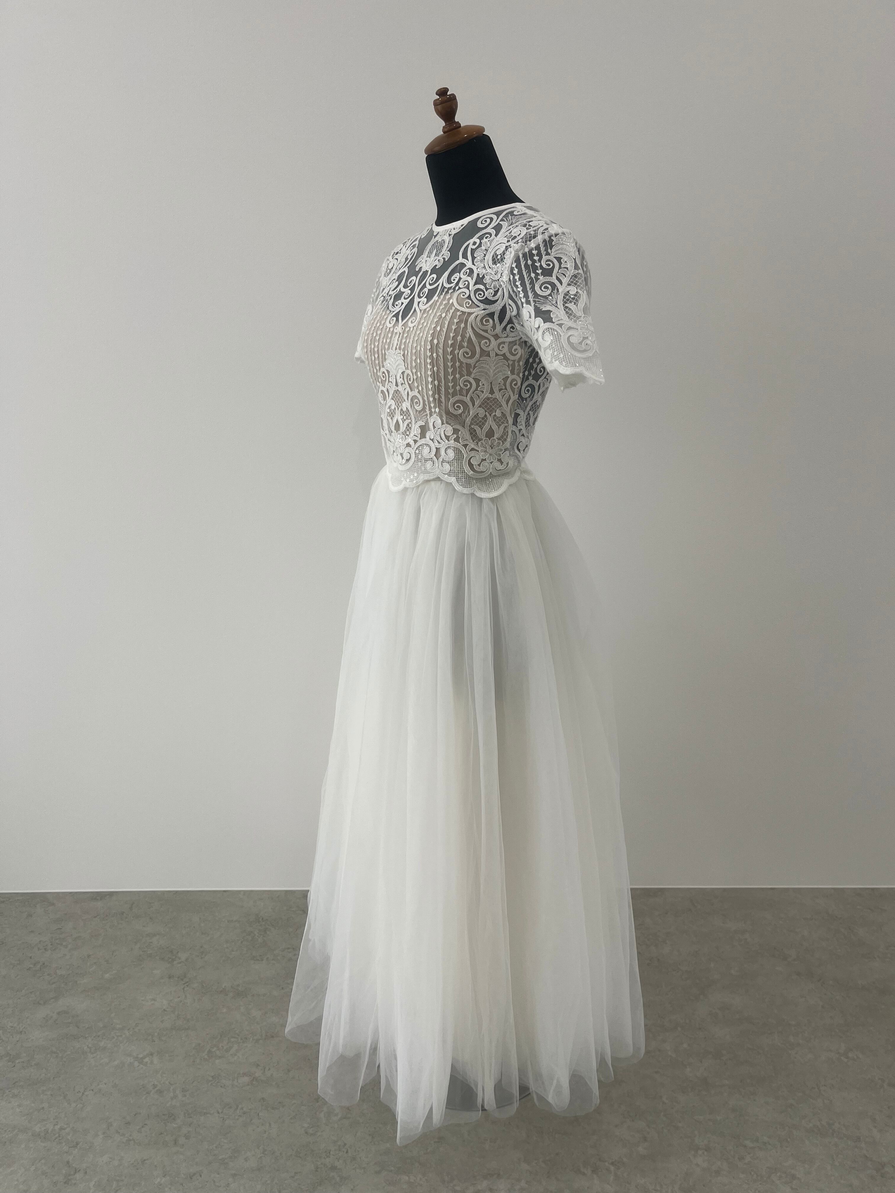 エレガントな印象を与える刺繍トップスとチュールスカートのセパレートドレスです。