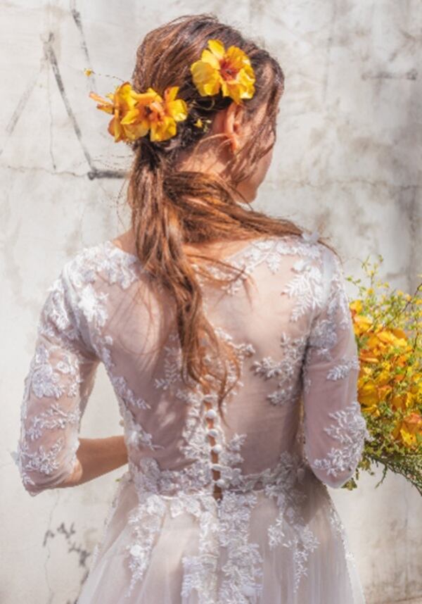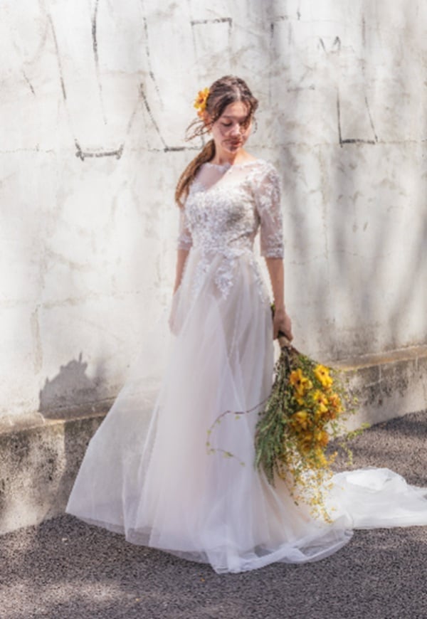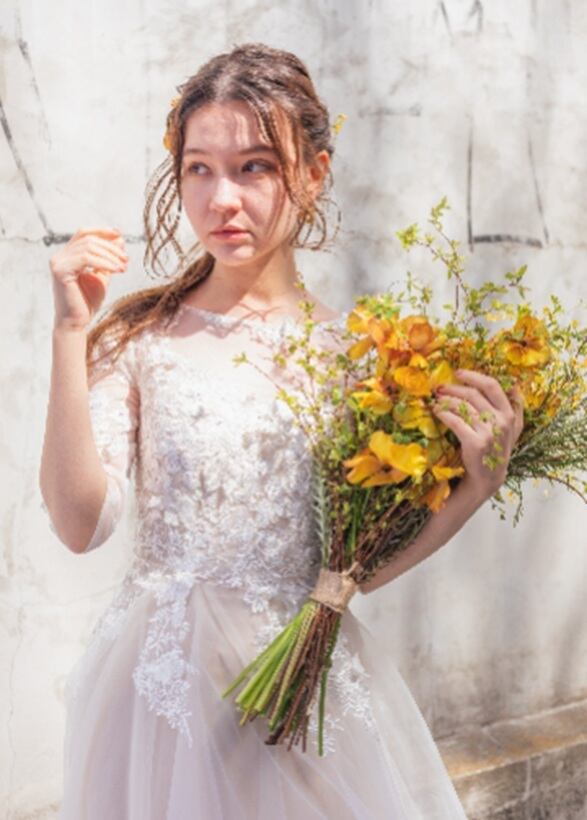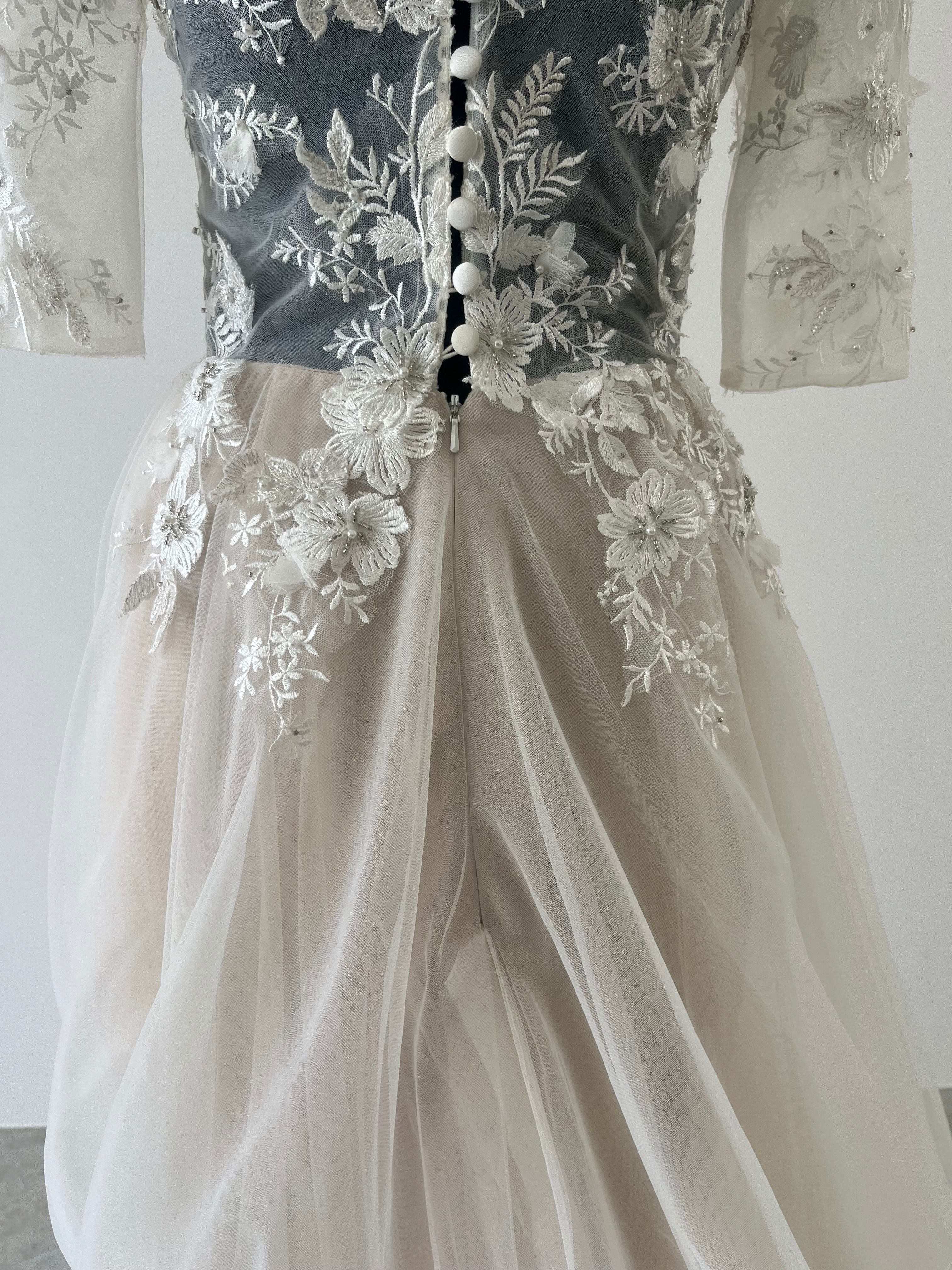 リーフ柄の刺繍と、立体的なフラワーモチーフを散りばめ、クラシカルかつフェミニンなデザインに仕上げました。