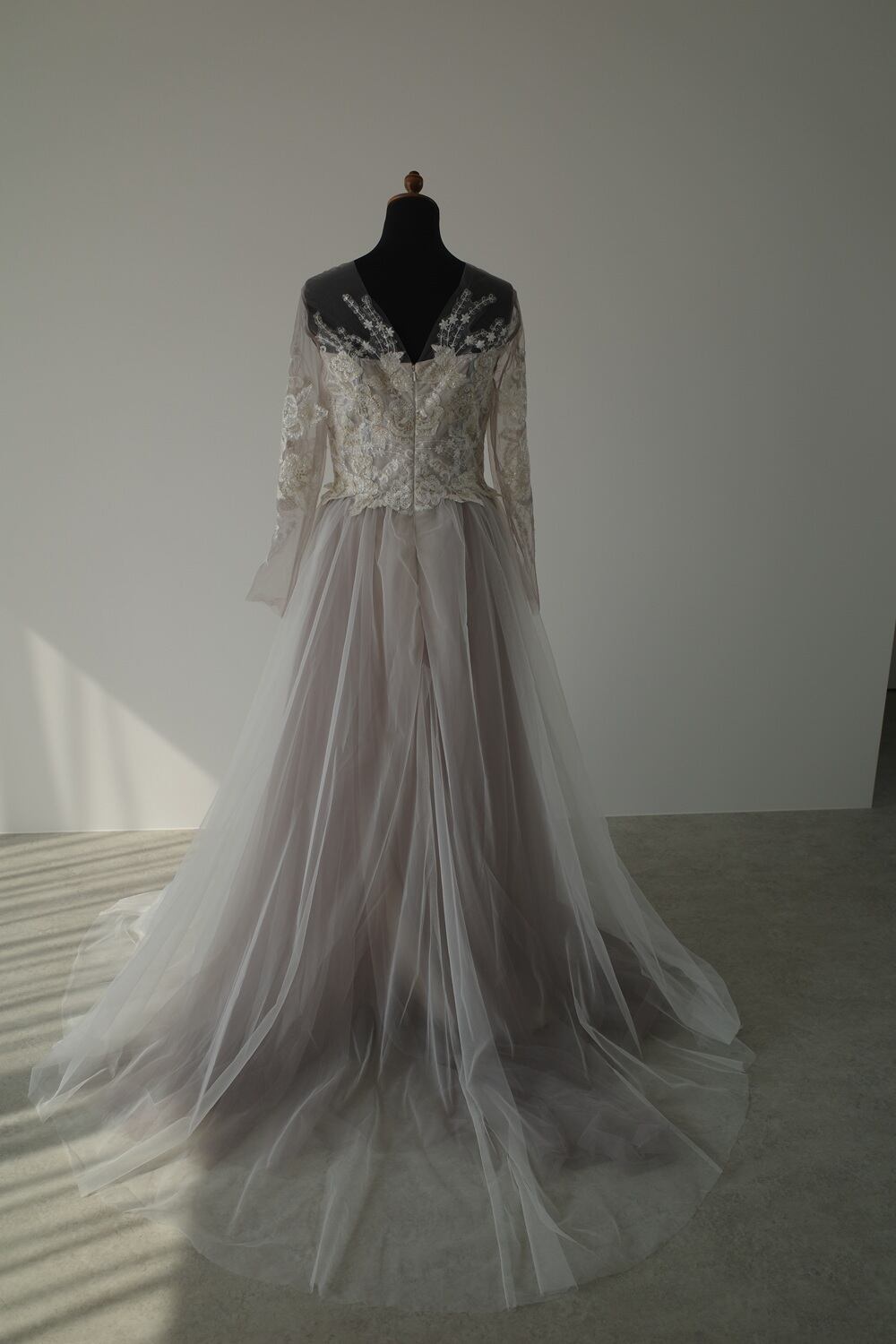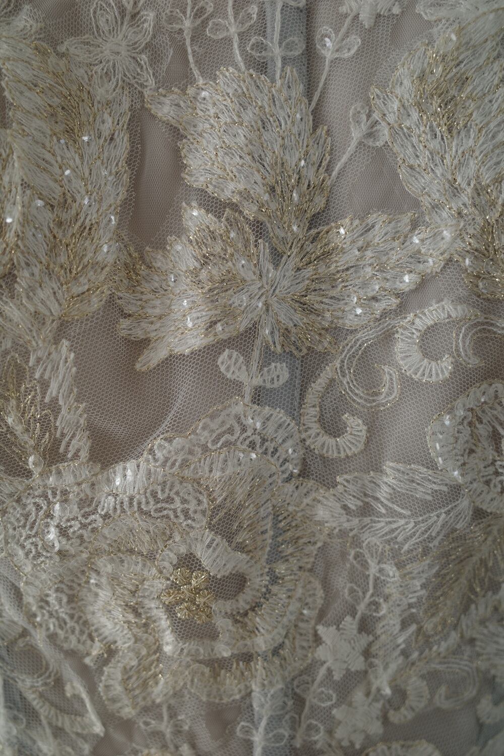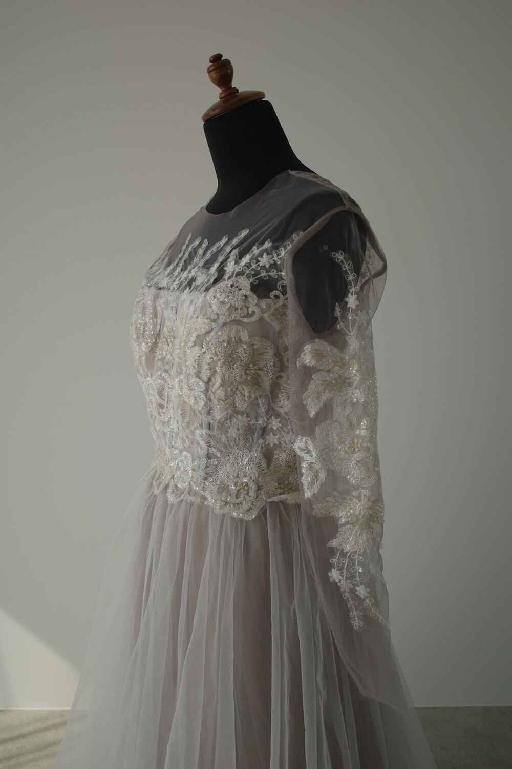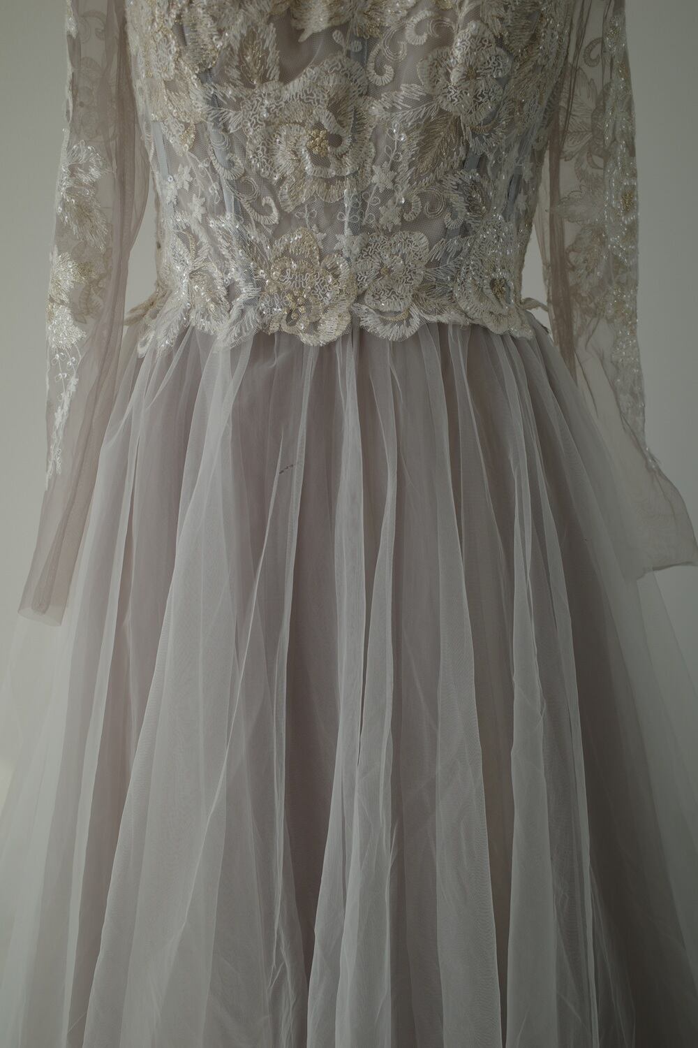 ゴールドを織り交ぜた刺繡レースがチュールのグレーとマッチして