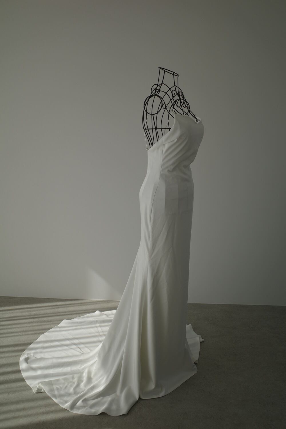 背中はクロスデザインで、リボンはご自身で結ぶタイプとなります。