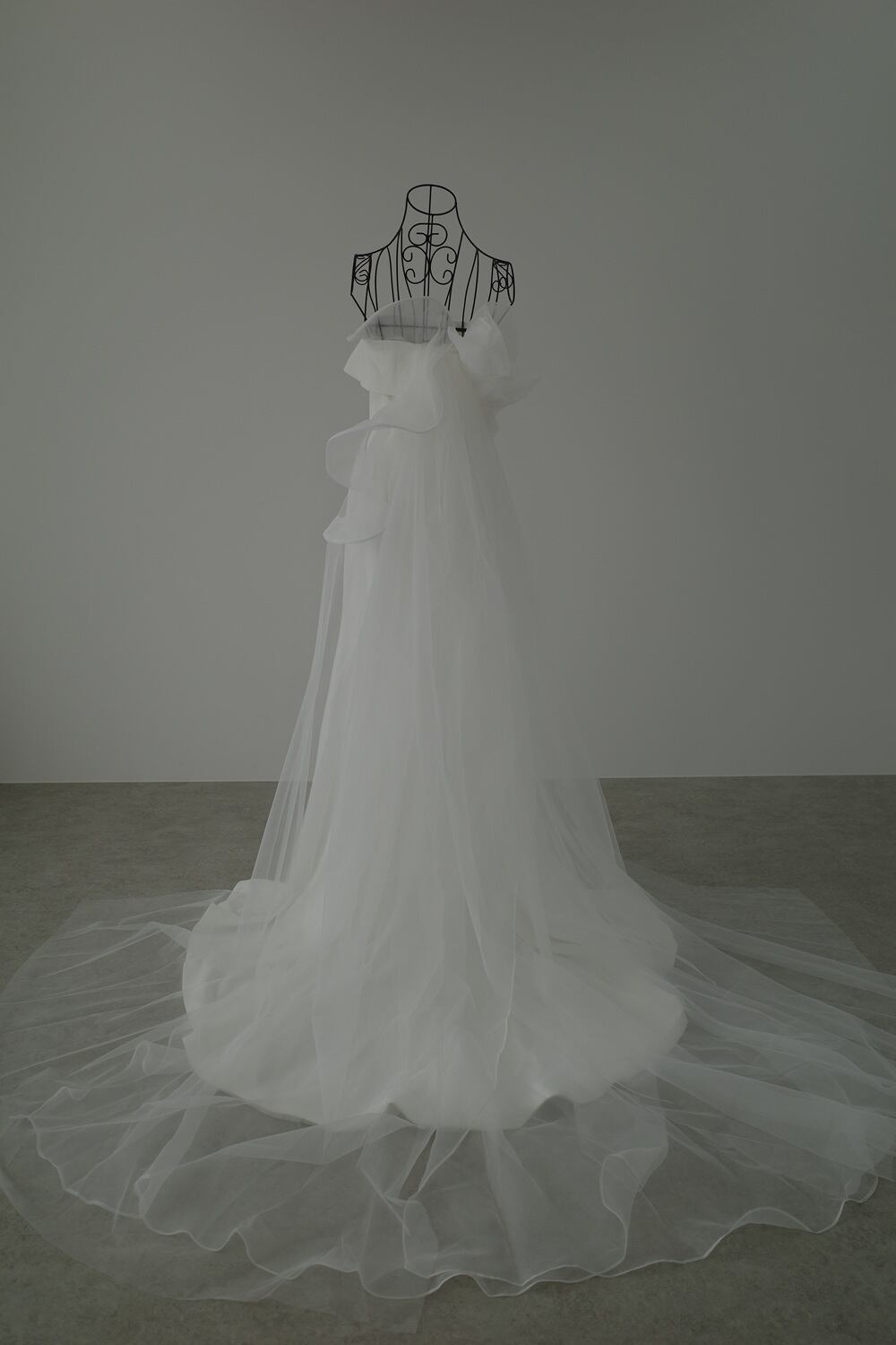 背中の装飾は透け感とふんわり感のあるオーガンジーとチュールを使用しております。