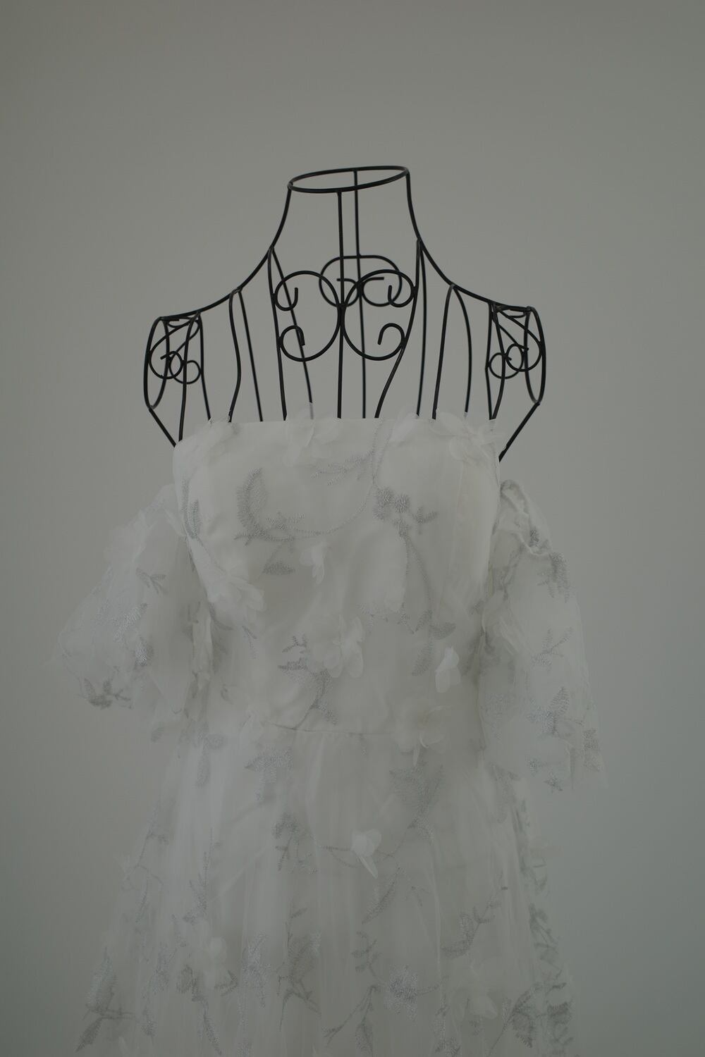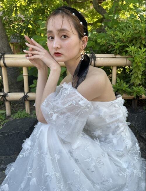 立体的なレースと刺繍が華やかで目を惹くドレス。