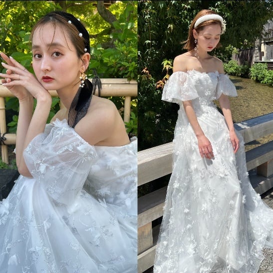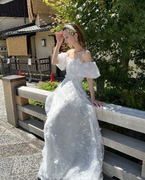 立体的なレースと刺繍が華やかで目を惹くドレス。