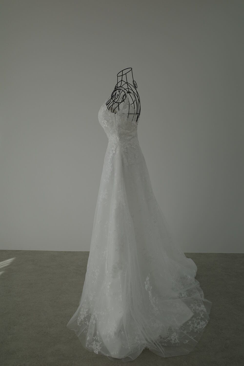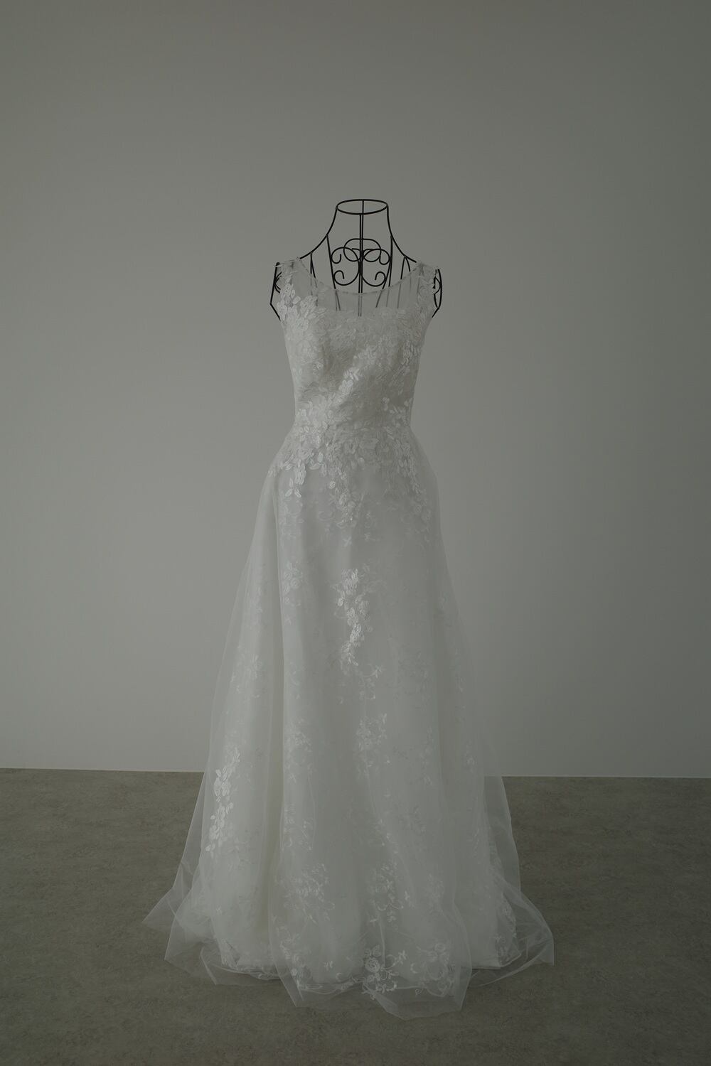 チュールの裏地には小花柄レースを使用し、全体的にエレガントな印象に。