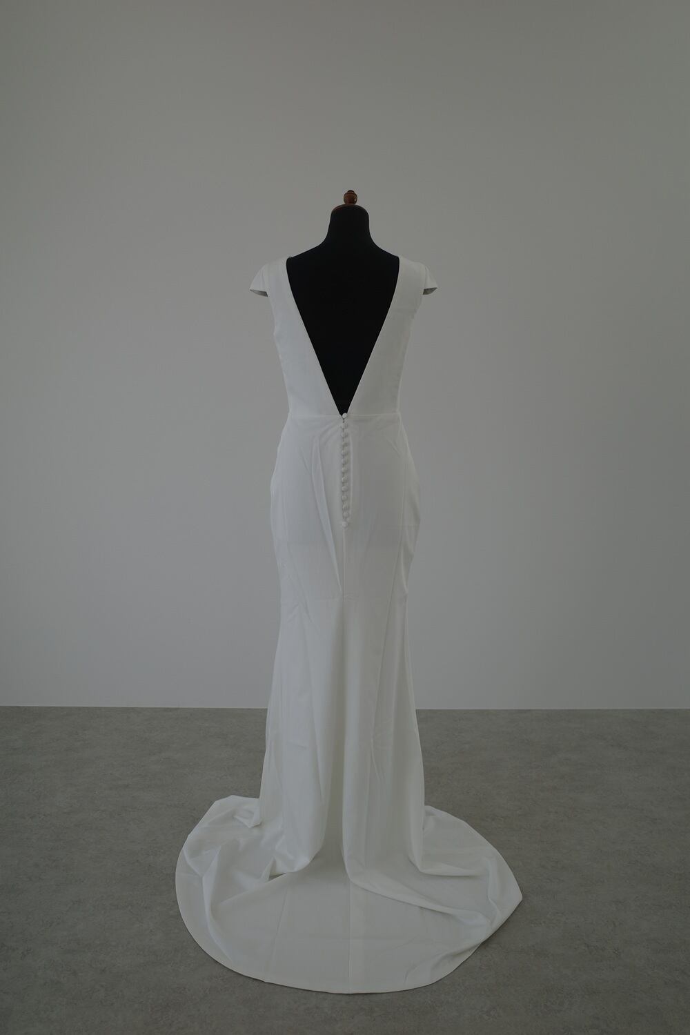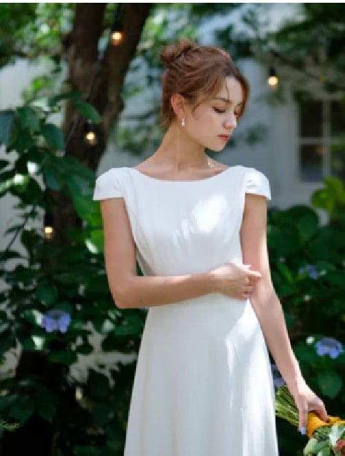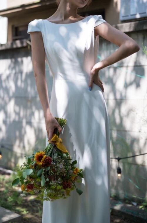 光沢を抑えた柔らかなサテン生地を使用したドレス。