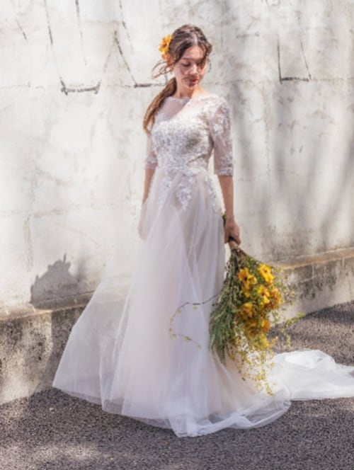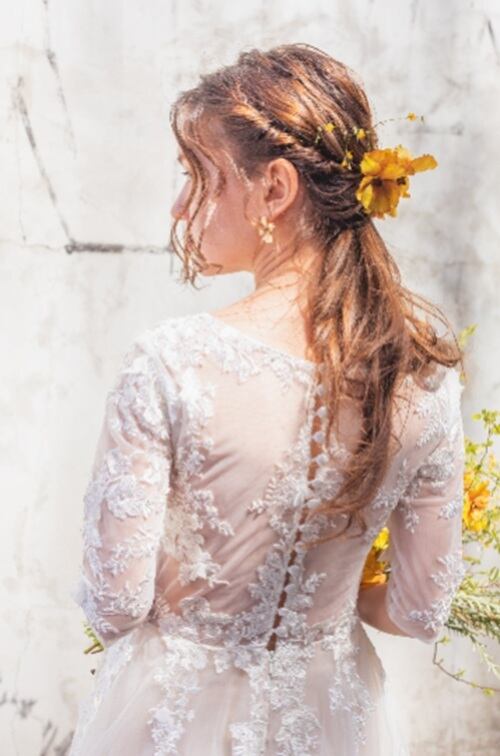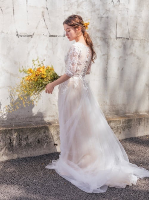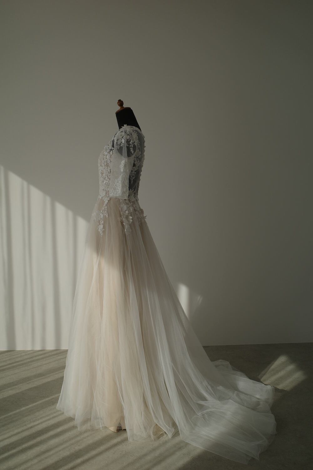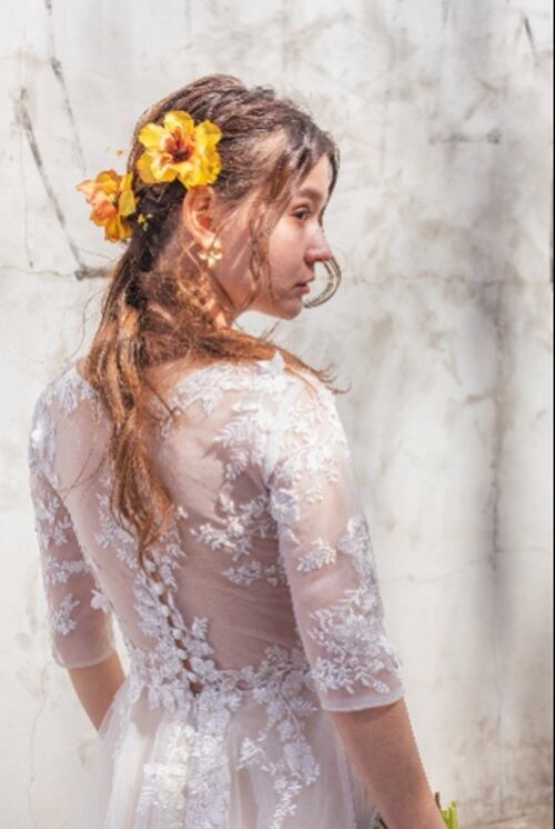 リーフ柄の刺繍と、立体的なフラワーモチーフを散りばめ、クラシカルかつフェミニンなデザインに仕上げました。