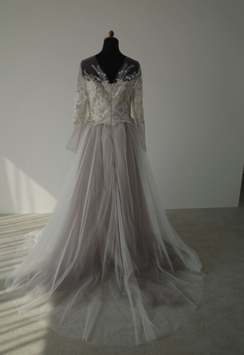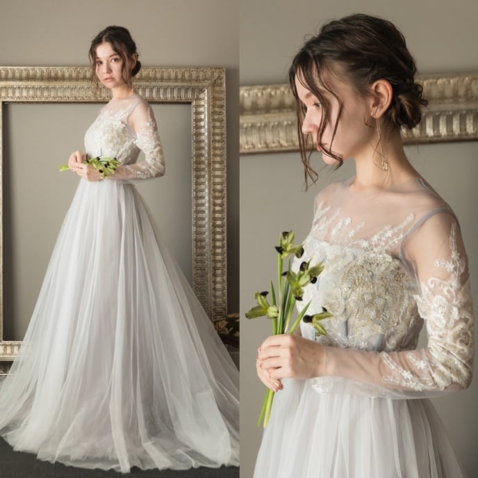 Sample Sale 刺繍 Aライン チュール グレー カラードレス(W87)【G222】