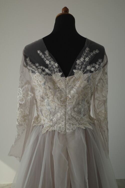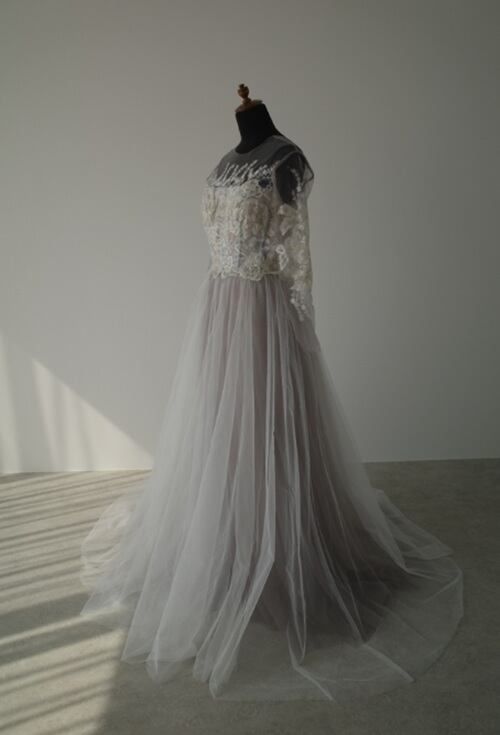 ゴールドを織り交ぜた刺繡レースがチュールのグレーとマッチして