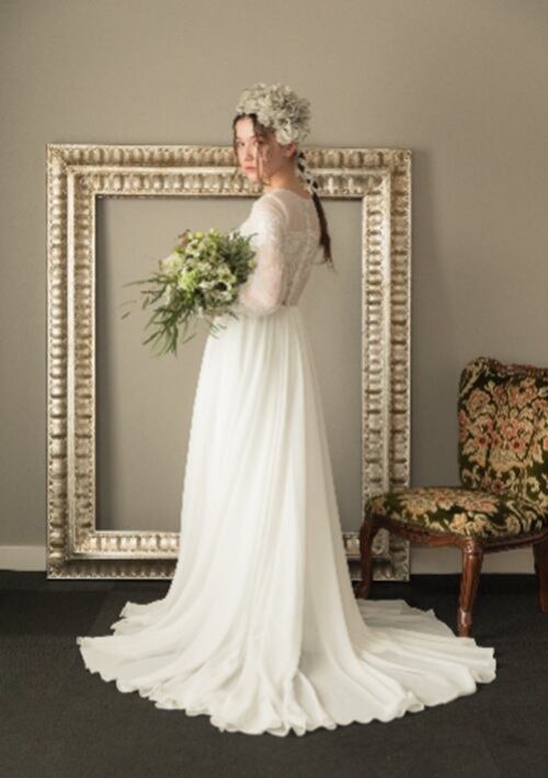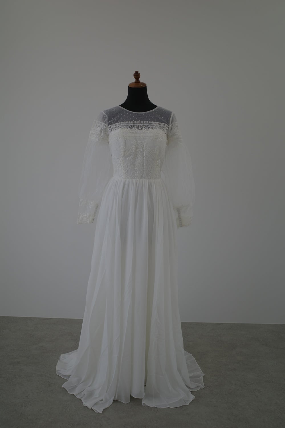 Sample Sale ボートネック レース 刺繍 ボリューム袖 シフォン ウエディングドレス(W92)【G242】