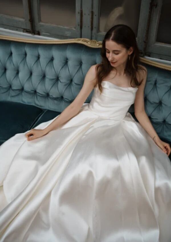 ミカド風の重厚感のあるサテン生地を使用したドレス。