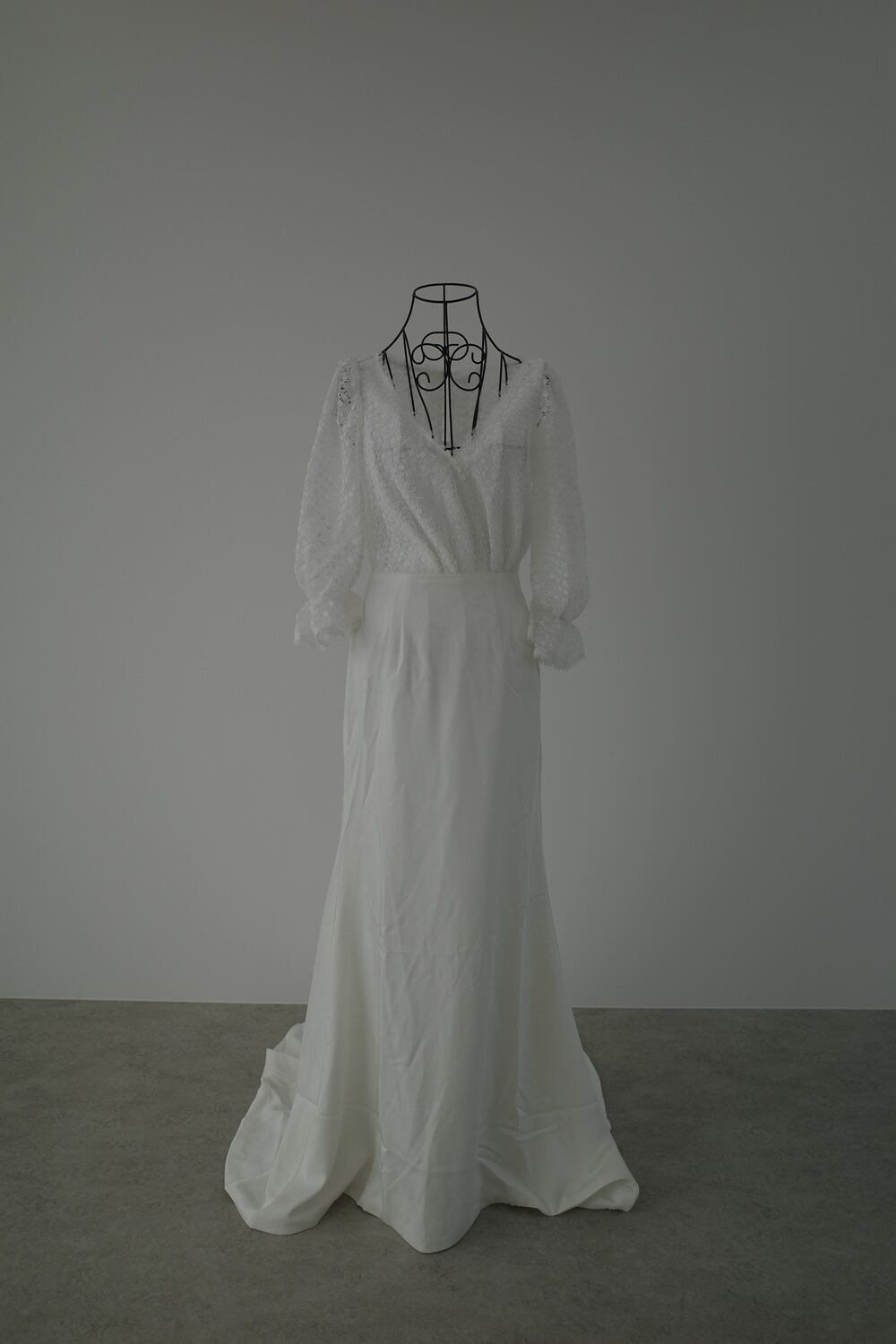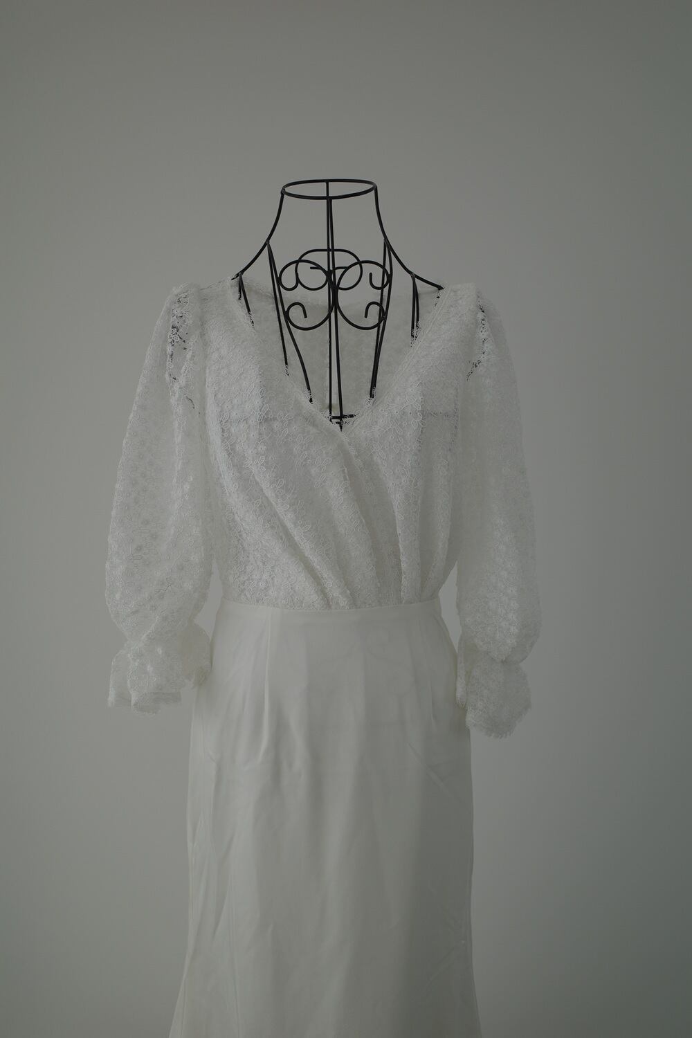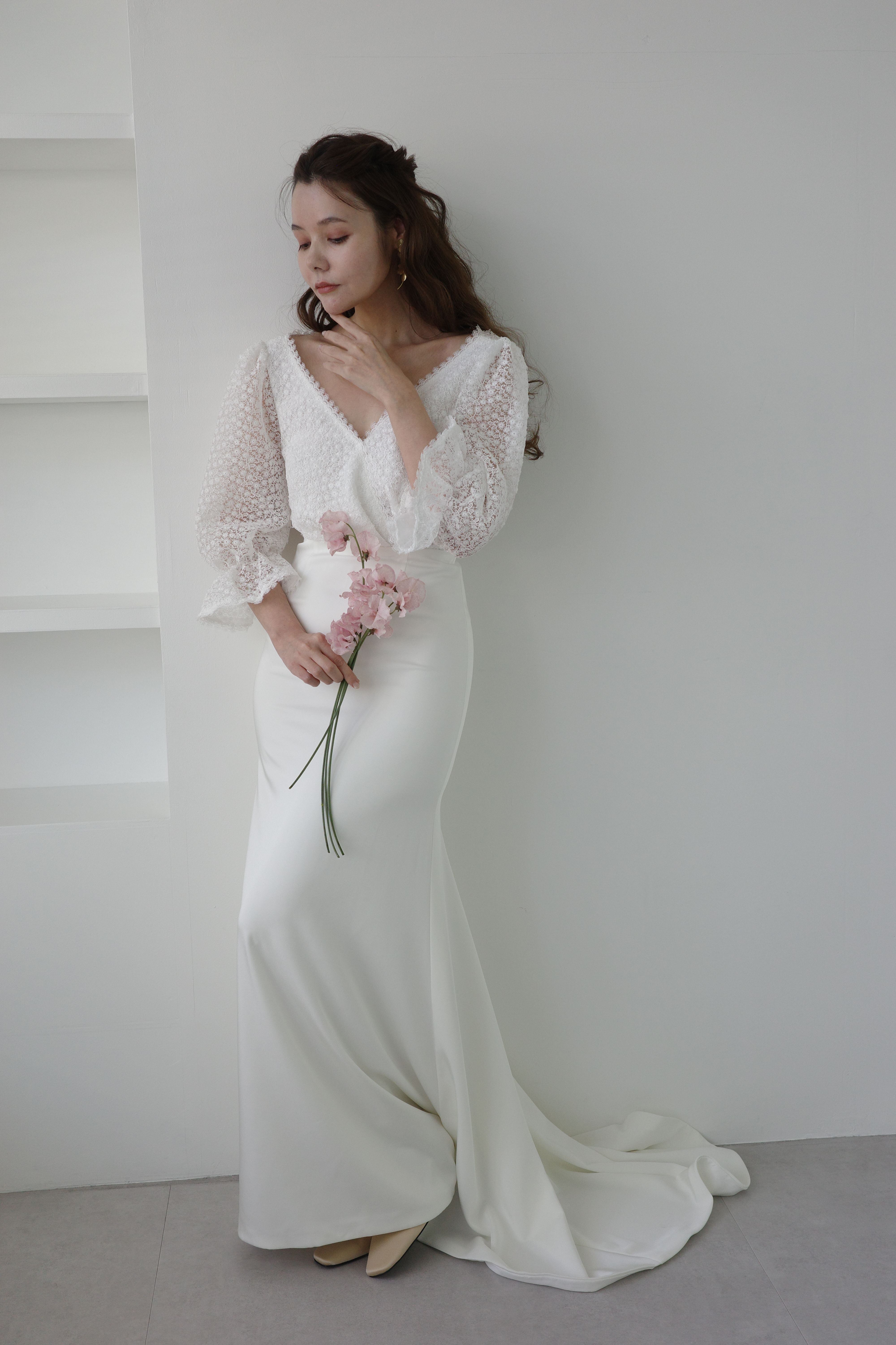 カシュクール風のトップスに、柔らかなサテン生地のスカートの組み合わせが