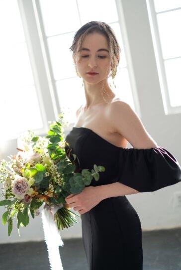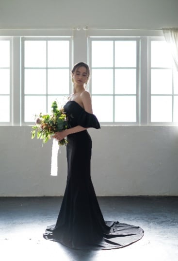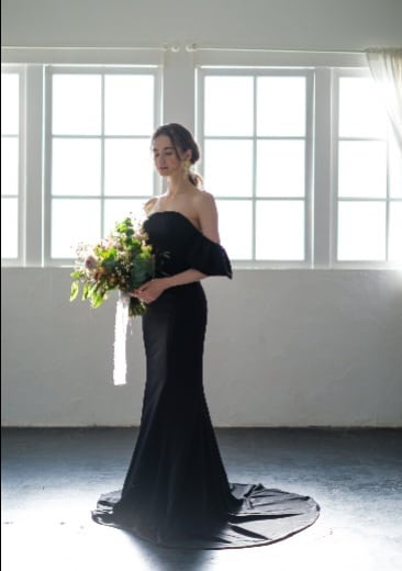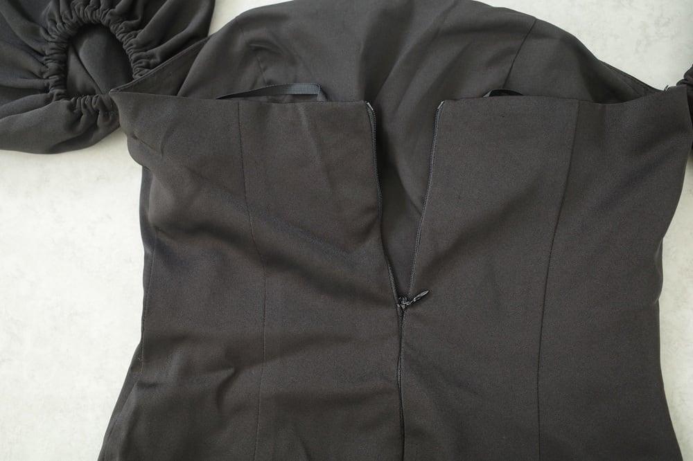 Sample Saleオフショルダー ボリューム袖 サテン ブラック ソフトマーメイドドレス(W225BK)【G166】