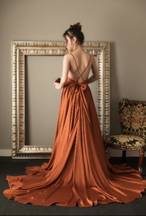 落ち着いた深みのあるテラコッタカラーが上品なドレス。