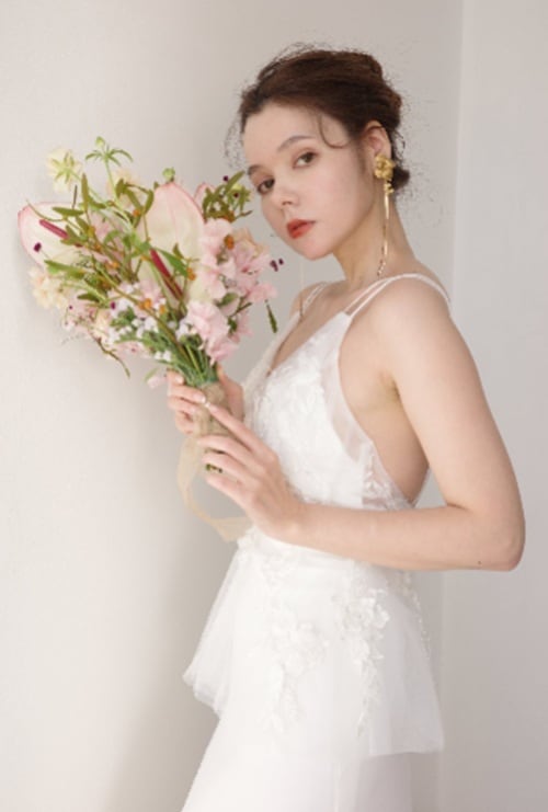 3Dの刺繍デザインと腰周りのフレアデザインが印象的なドレス。