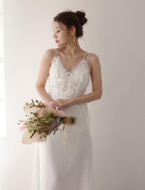 3Dの刺繍デザインと腰周りのフレアデザインが印象的なドレス。