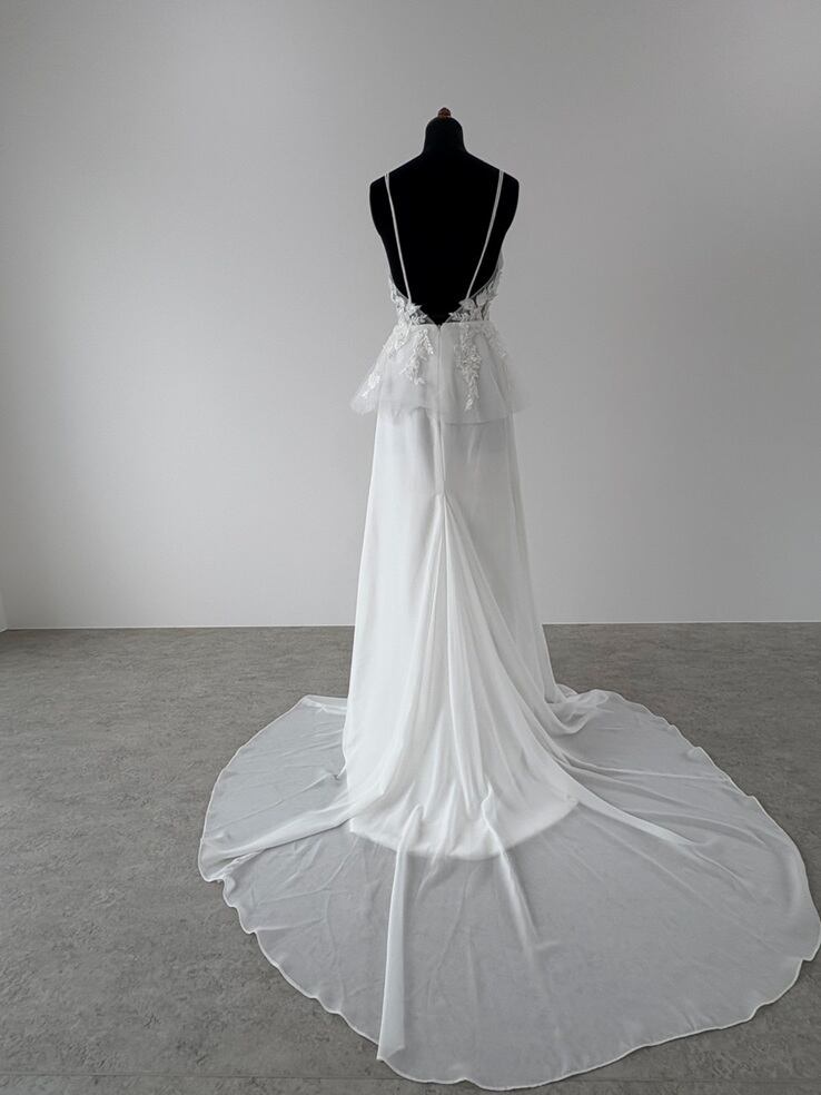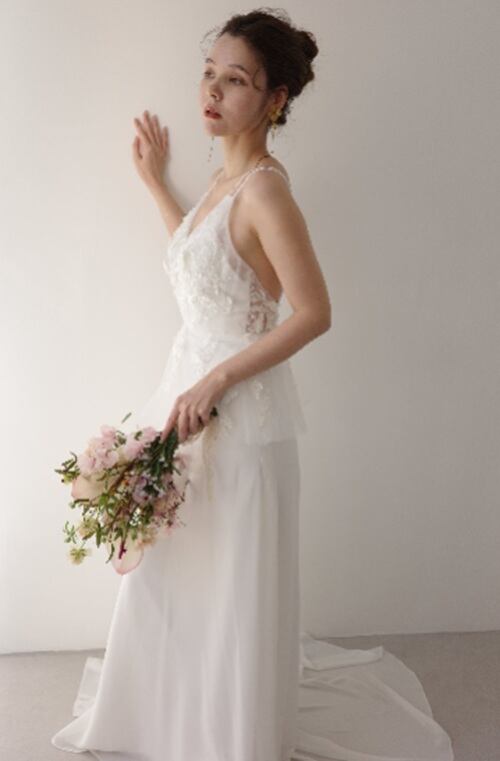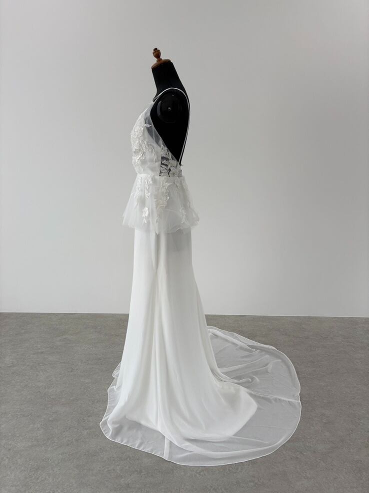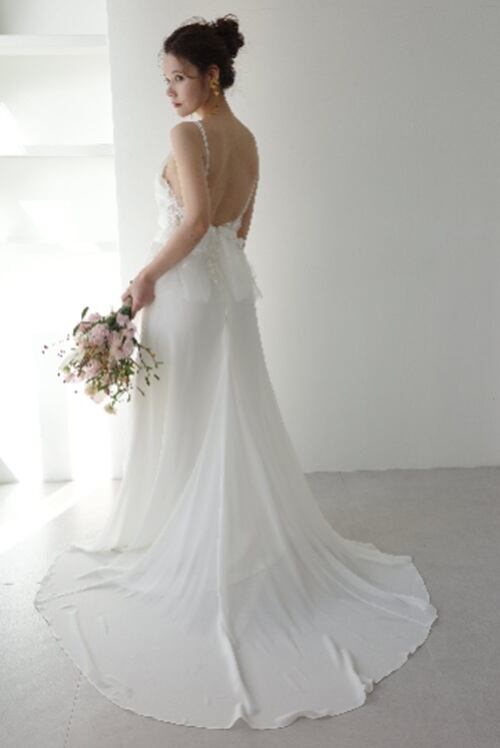 3Dの刺繍デザインと腰周りのフレアデザインが印象的なドレス。