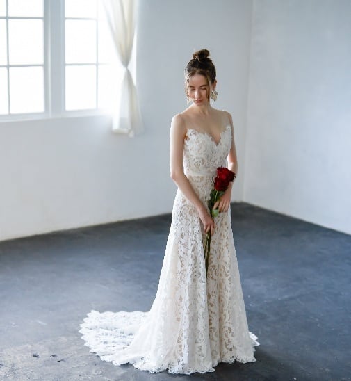 大柄で存在感のあるレースがエレガントなスレンダードレス。