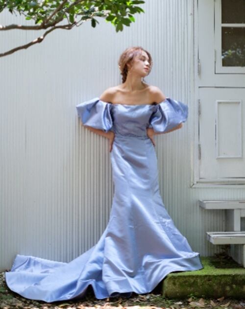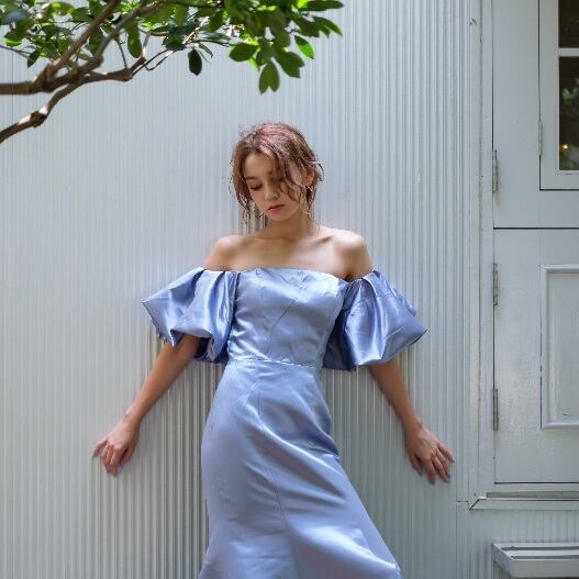Sample Sale Lサイズ・オフショルダー ボリューム袖 ライトブルー サテンドレス(W233)【G336】