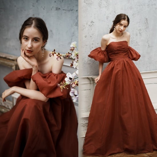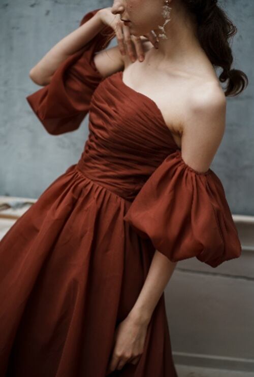 ふんわりとしたオーガンジーサテンを使用したパフスリーブドレス。
