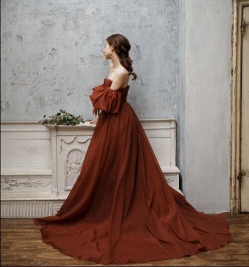 ふんわりとしたオーガンジーサテンを使用したパフスリーブドレス。