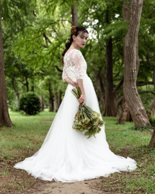 リーフ&小花のレースを使用したナチュラルでフェミニンなAラインドレス。