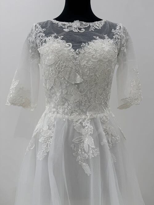 鎖骨やや下のボートネックと、程よい五分丈袖が花嫁の上品さを際立たせてくれます。