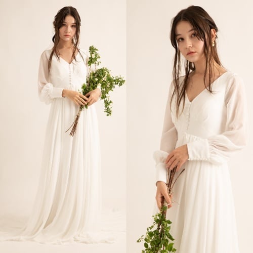 Sample Sale Sサイズ:Vネック くるみボタン ロングスリーブ シフォンドレス(W196)【G351】