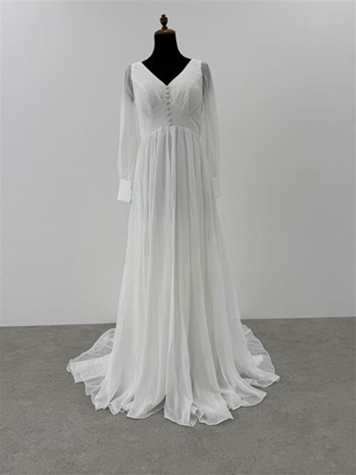 Sample Sale Lサイズ:Vネック くるみボタン ロングスリーブ シフォンドレス(W196)【G353】