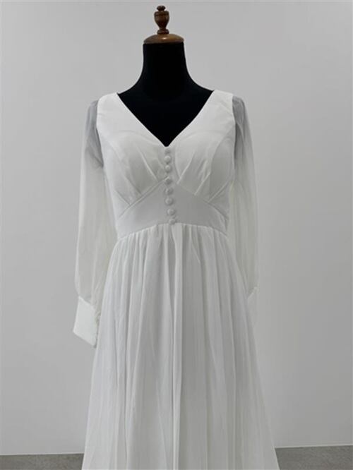 Sample Sale Lサイズ:Vネック くるみボタン ロングスリーブ シフォンドレス(W196)【G354】