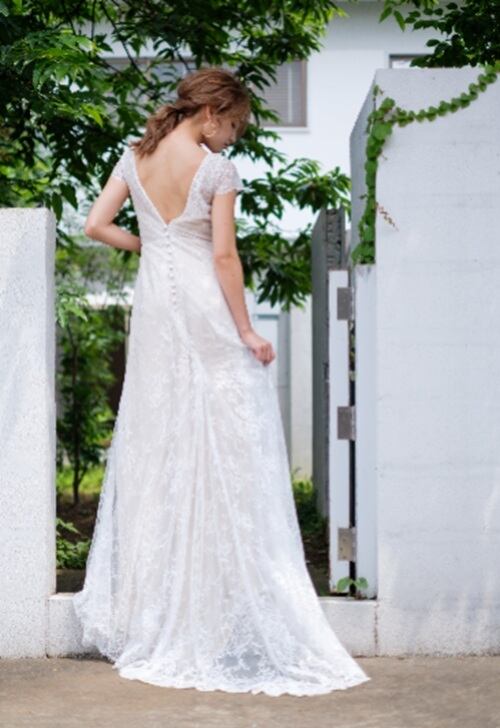 背中のVのカッティングとくるみボタンがさりげなく可愛いです。