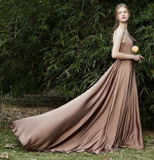 シックなお色味と艶やかな生地感がエレガントなカラードレス。