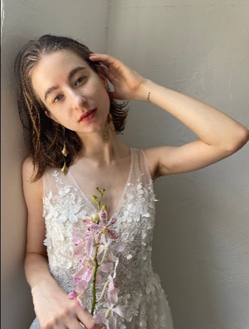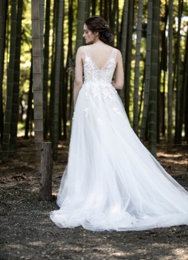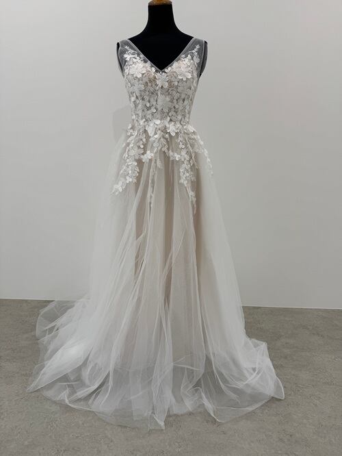 立体的なフラワーレースが華やかで可憐なAラインドレス。