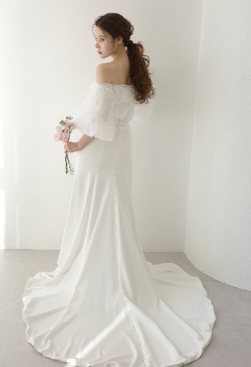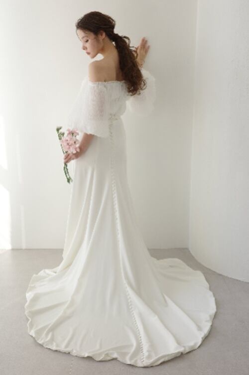 モデルがトップスの下に着用しているドレスは品番W205(https://dressproduction.com/?pid=156616144)です。