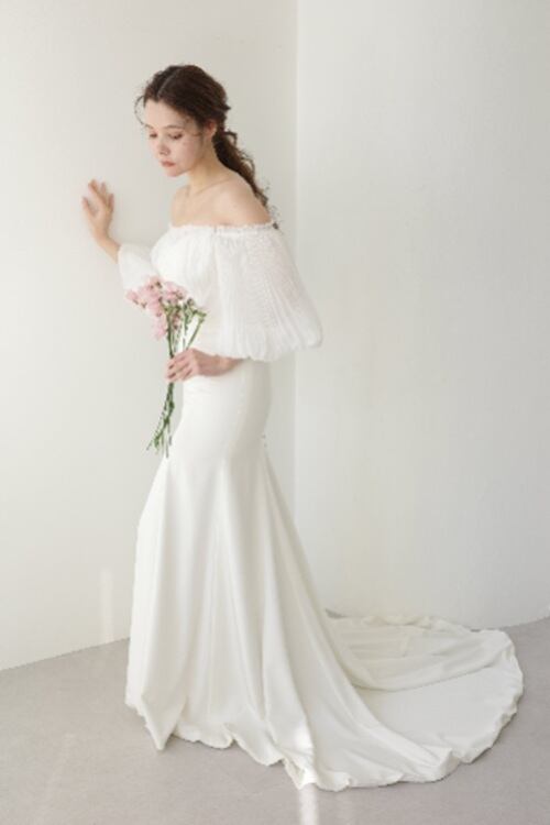 モデルがトップスの下に着用しているドレスは品番W205(https://dressproduction.com/?pid=156616144)です。
