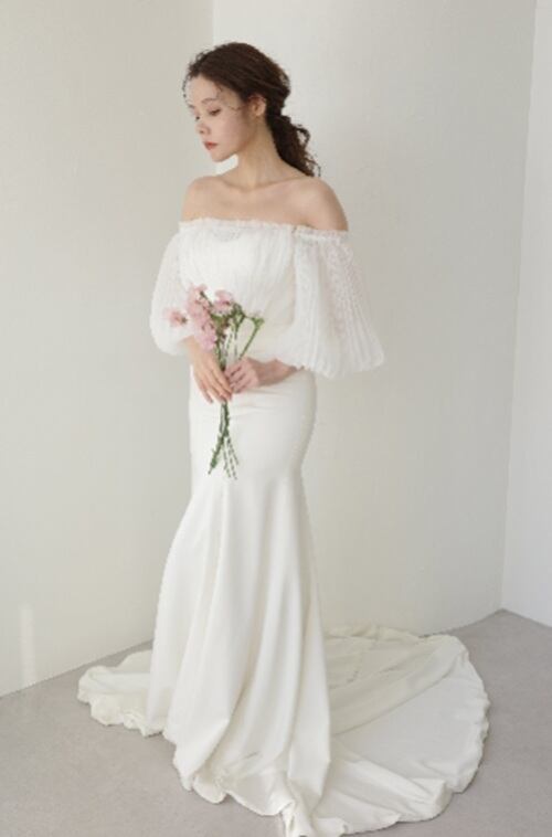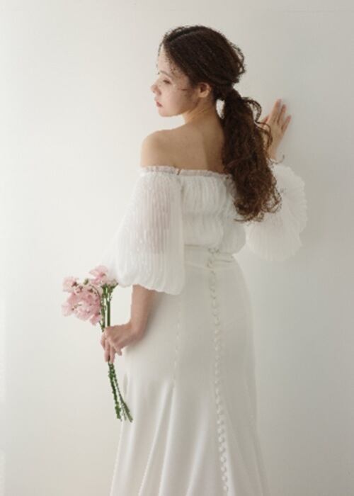 モデルがトップスの下に着用しているドレスは品番W205(https://dressproduction.com/?pid=156616144)です。