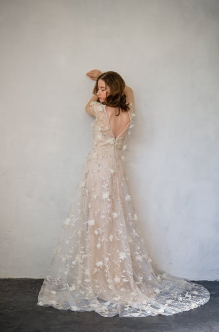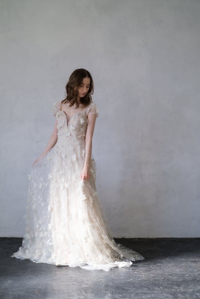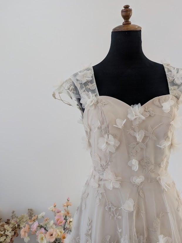立体的なレースと刺繍が華やかで目を惹くドレス。